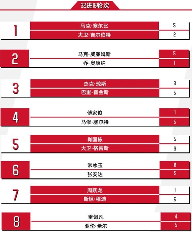 中国选手参与的其余场次比赛:卫冕冠军肖国栋打出两杆50+(51、97)5-3战胜大卫格雷斯,张安达打出四杆50+连胜五局5-0横扫同胞常冰玉强势拿下德比战,傅家俊1-5不敌马修塞尔特,周跃龙同样1-5输给了斯坦穆迪。